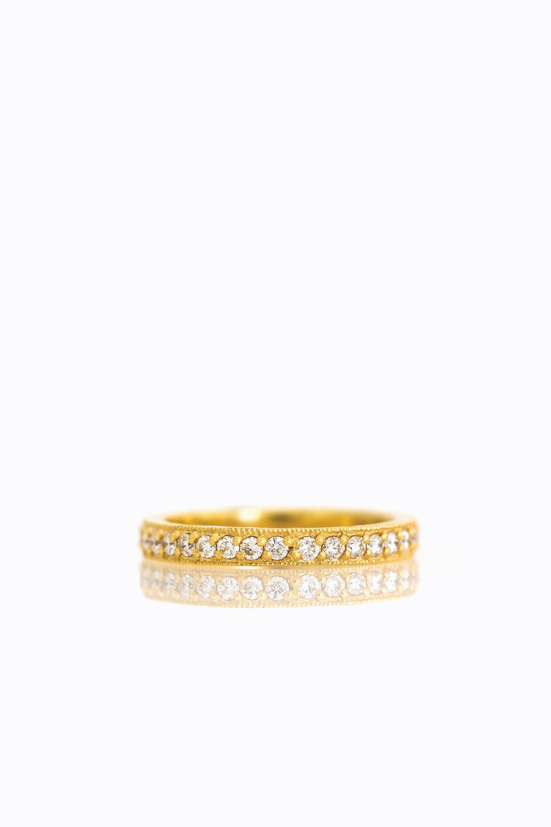18K Royal Yellow Gold or Platinum ring with thirty-three 1.5mm continuously set white diamonds. 0.50 diamond carat weight.