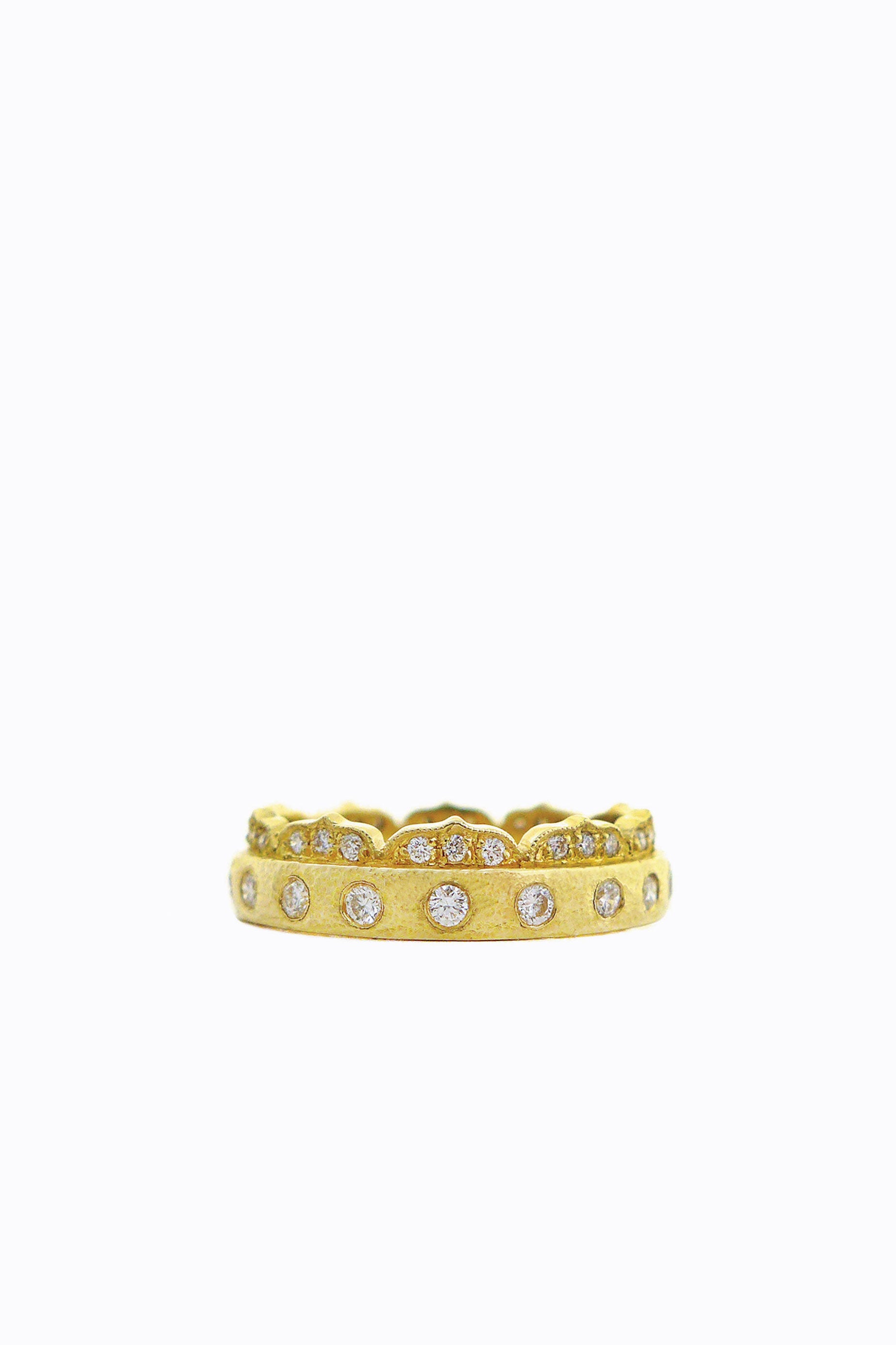 18K Royal Yellow Gold ring with scalloped edge and continuous white diamond setting. 0.50 diamond carat weight.